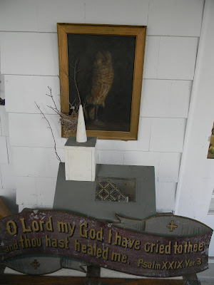After an entire late autumn and winter with NO flea markets, we awoke last Sunday before dawn, and pulled out the Robins In The Trundle Bed totes painted with the images of a gorgeous woman, perfectly dressed and coiffed! We, unlike the French lass decorating our bags, put on as many layers under our winter coats as we could and still be able to move! When we arrived at the market, the ground was covered in frost and was hard and cracked under our feet from the recent drought. I think we were sleeping standing up, as we would spy something we thought was simply "I'll die if I don't buy that and make it my own NOW" just as someon grabbed the antiques out from under our noses. Between the sleepiness and the inability to move our arms from the excessive layering and the freezing temps, it is a testament to our treasure hunting abilities that we managed to unearth these finds! As the morning wore on and the April sun warmed the ground, the earth turned to mud and we began to thaw. We found an antique gingham apron with hand embroidered flowers; a linsey woolsey that a frugal New England housewife had patched and re-patched and then patched again; a stack of Peterboro New Hampshire primers, one that had been turned into a recipe book; a tin sign from a Church, hand painted with the most inspirational psalm; two antlers made into beautiful brushes... A few more times around the field and then off to the cafe. After all that work the steaming mugs of coffee never tasted so good!